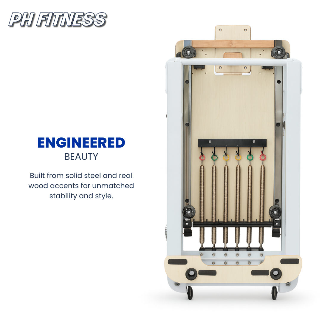 De PH Fitness Reformer is ontworpen met oog voor detail. Het stevige gepoedercoate metalen frame zorgt voor stabiliteit en een lange levensduur, terwijl de lichte houten accenten van gelamineerd berkenhout een stijlvolle uitstraling geven die perfect past in elke moderne thuisgym of studio.